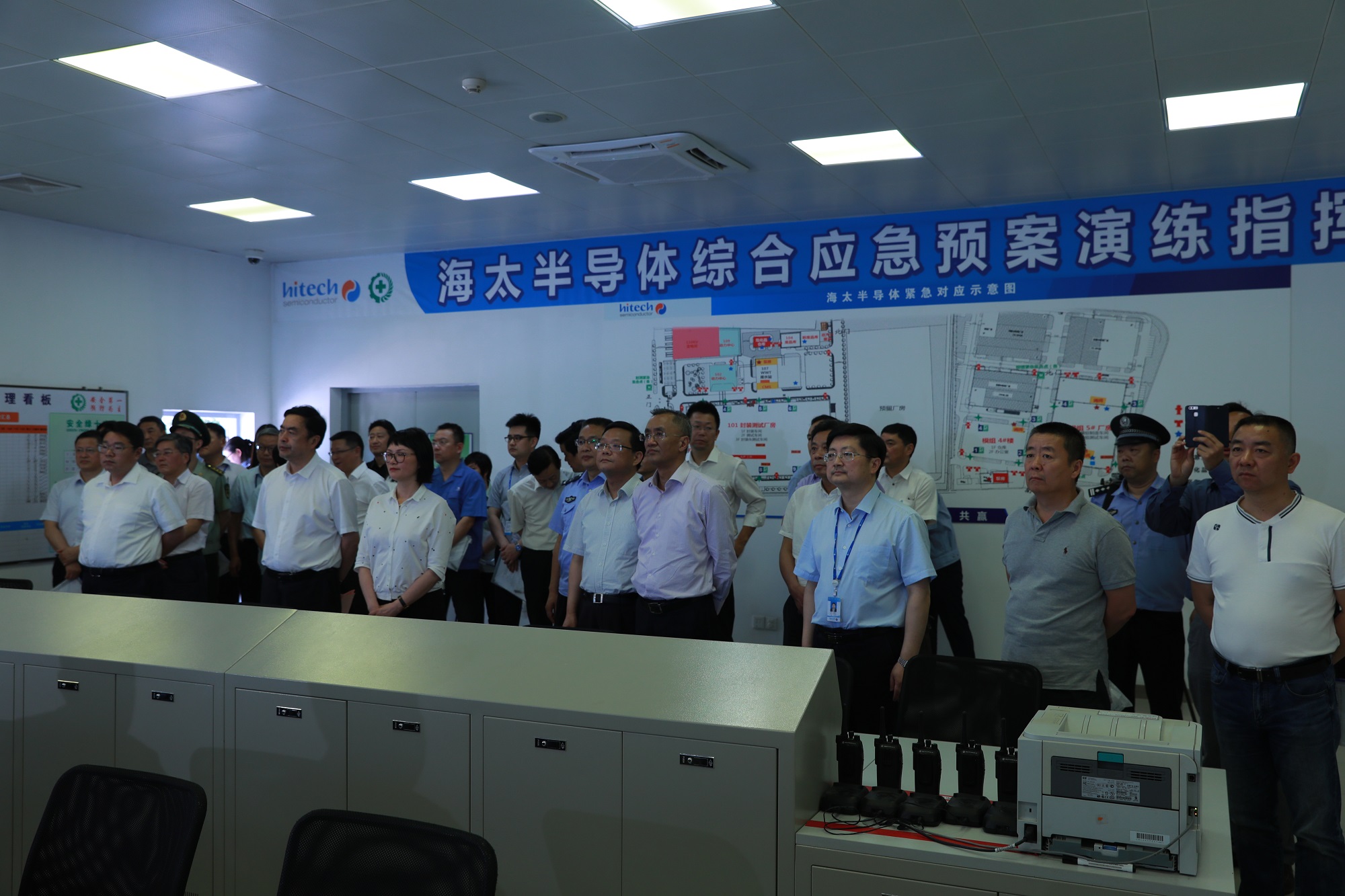 勾当进程中,高亚光副市长一行听取了海太半导体(无锡)无限公司的宁静出产使命报告请示及急预案练习训练先容,观赏了公司的应急批示室。跟着市当局周浩明副秘书长颁布发表练习训练起头,摹拟海太半导体公司封测厂区PKG-A/P地区丙酮遇静电突发火警,敏捷启动综合应急预案,展开现场告急措置,并构造近1200名员工应急分散,美满实现了应急措置使命。应急预案练习训练竣事后,团体党委布告、董事局主席蒋国雄慎重颁布发表2018年宁静出产月勾当正式启动,财产团体宁静出产月勾当盛大拉开帷幕。